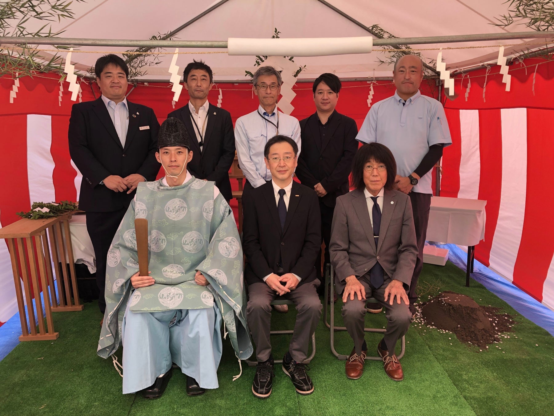 地鎮祭には、株式会社Ginza取締役 栗田管理本部長、管理建築士 荒井一級建築士、建設会社である積水ハウス株式会社関係者の方々、及び工事関係者の方々が参列し、工事の安全を祈願致しました。