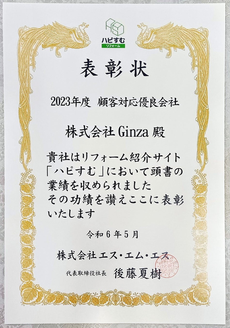 併せて、リフォームマッチングサイト「ハピすむ」が主催する「2023年度表彰制度」において、全国1,000社以上の加盟リフォーム会社の中から、2度目の「顧客対応優良会社」として表彰されました。