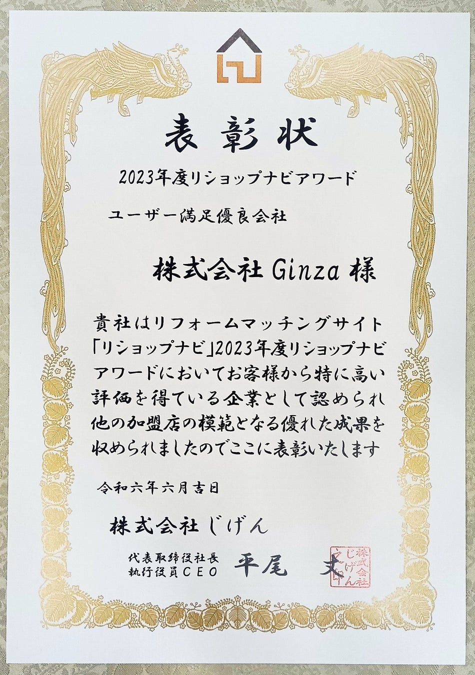 水回りを中心に住宅リフォームを手掛ける株式会社Ginza(本社:東京都中央区/代表取締役社長:池田馨)は、見積もり依頼件数No.1の国内最大級リフォームマッチングサイト「リショップナビ」が主催する「リショップナビアワード2023」において、全国過去最多4,000社以上の加盟リフォーム会社の中から、2度目の「ユーザー満足優良会社」として表彰されました。